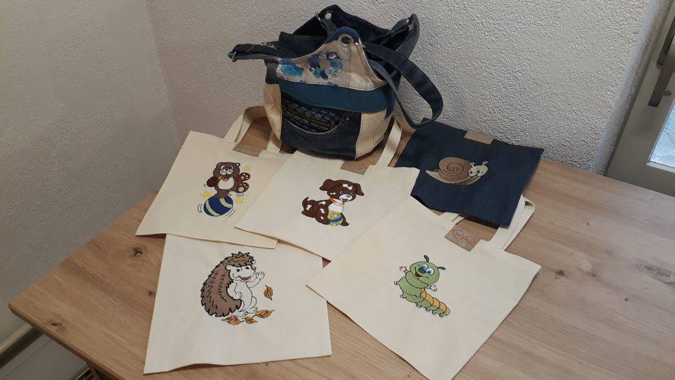 Die Stofftäschli können nach eigenen Wünschen in Grösse und Bestickung mit Motiv und Namen gefertigt werden. Stofftäschli mit Stickmotiven wo die gehäkelten Tierchen rausgucken ergeben ein tolles und sehr spezielles Geschenk.