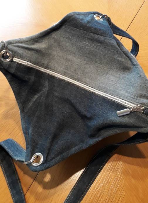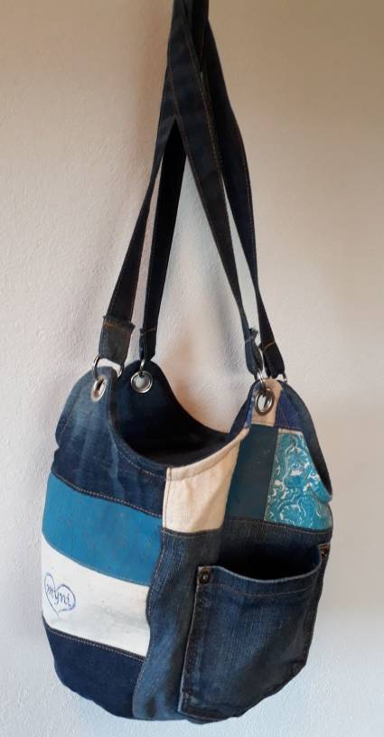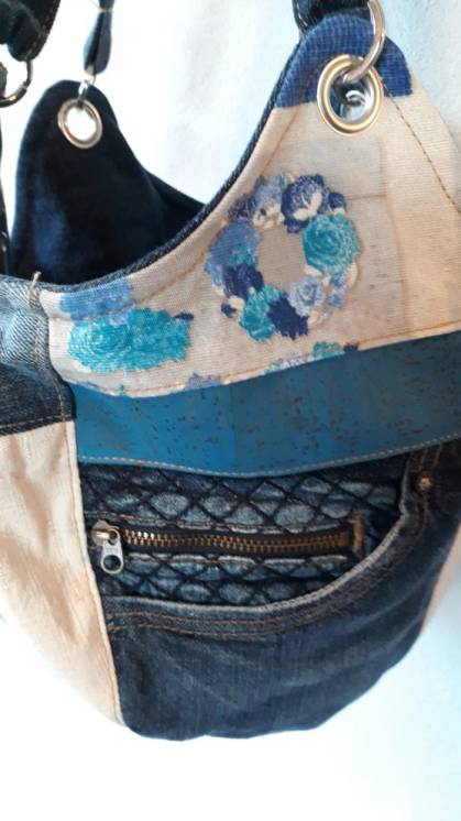 Schöne vielseitig verwendbare Tasche aus recyclierter Jeans, Kork und Dekostoff.